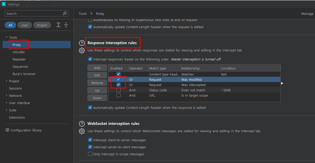 Proxy > Response interception rules > [Relationship] Was modified / Was intercepted 체크
